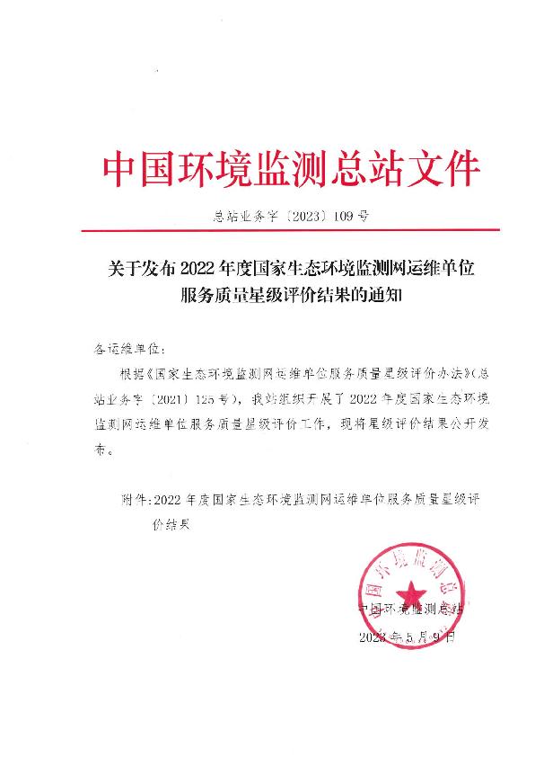 近期中國環(huán)境監(jiān)測總站根據(jù)《國家生態(tài)環(huán)境監(jiān)測網(wǎng)運維單位服務(wù)質(zhì)量星級評價辦法》(總站業(yè)務(wù)字(2021)125 號)工作已結(jié)束,經(jīng)過中國環(huán)境監(jiān)測總站嚴(yán)格的評審和公示《總站業(yè)務(wù)字〔2023〕109號》,公司參與國家生態(tài)環(huán)境監(jiān)測網(wǎng)運維單位服務(wù)質(zhì)量四星級榮譽(同一星級運維單位排名不分先后)。