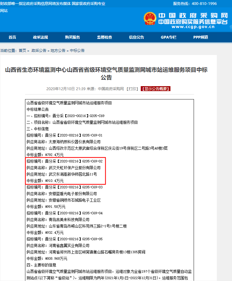 2020年12月10日,武漢天虹環(huán)保產(chǎn)業(yè)股份有限公司成功中標(biāo)“山西省省級(jí)環(huán)境空氣質(zhì)量監(jiān)測(cè)網(wǎng)城市站運(yùn)維服務(wù)項(xiàng)目”(第2包),項(xiàng)目金額910.4萬元。運(yùn)維服務(wù)城市包含忻州和呂梁20個(gè)縣(區(qū)、市)共計(jì)40個(gè)運(yùn)維站點(diǎn);運(yùn)維服務(wù)范圍包括:各省級(jí)站所有監(jiān)測(cè)儀器(PM10、PM2.5、NOx、SO2、O3、CO)、氣象儀器、質(zhì)控設(shè)備(零氣發(fā)生器、動(dòng)態(tài)校準(zhǔn)儀)、數(shù)據(jù)采集與傳輸設(shè)備、輔助設(shè)備、防雷、消防等基礎(chǔ)設(shè)施的日常維護(hù)、質(zhì)量控制、故障維修、年度檢修、檢定等工作,以及站房租賃與維護(hù)、站房運(yùn)行電費(fèi)、視頻監(jiān)控、網(wǎng)絡(luò)通訊保障,并負(fù)擔(dān)相應(yīng)費(fèi)用,并須接受山西省生態(tài)環(huán)境廳和山西省生態(tài)環(huán)境監(jiān)測(cè)中心的質(zhì)控檢查和考核,確保省級(jí)站各項(xiàng)監(jiān)測(cè)儀器正常穩(wěn)定運(yùn)行并與省、市、縣環(huán)保部門聯(lián)網(wǎng)正常;運(yùn)維服務(wù)期2年。
