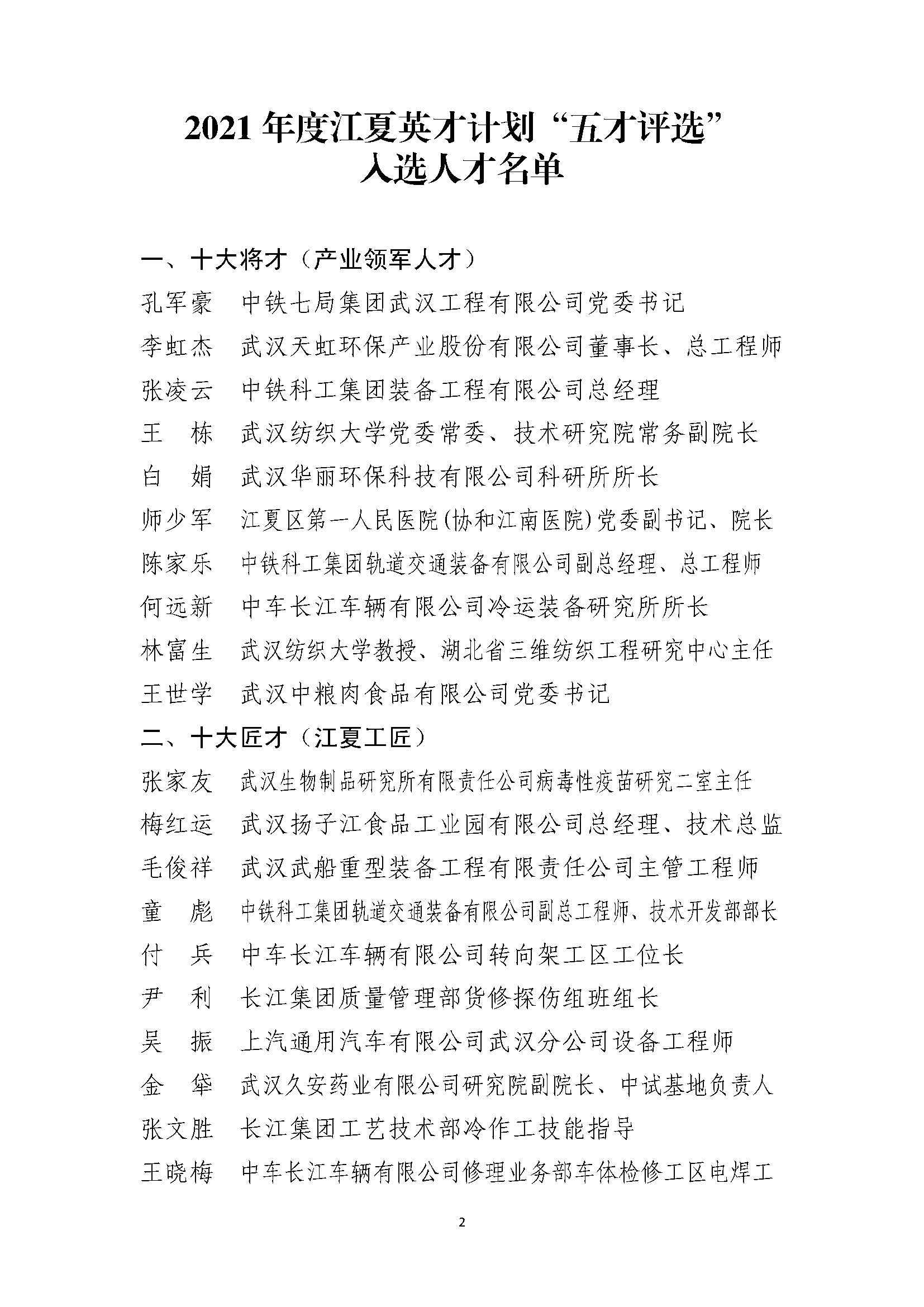2021年12月7日,中共江夏區(qū)委人才工作領導小組辦公室正式對外發(fā)布了《關于印發(fā)2021年度江夏英才計劃“五才評選”入選人才名單的通知》,公司李虹杰董事長榮膺“十大將才(產業(yè)領軍人才)”稱號。