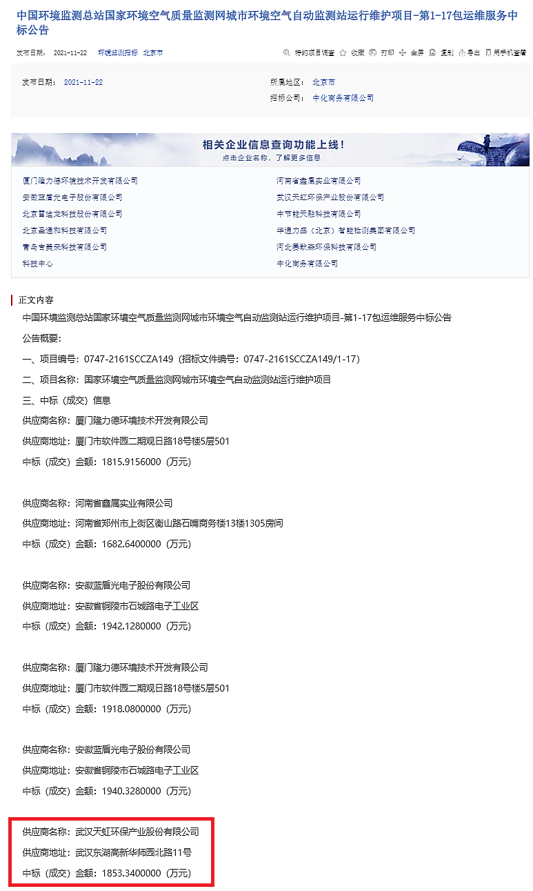 2021年11月22日,武漢天虹環(huán)保產(chǎn)業(yè)股份有限公司中標(biāo)“國(guó)家環(huán)境空氣質(zhì)量監(jiān)測(cè)網(wǎng)城市環(huán)境空氣自動(dòng)監(jiān)測(cè)站《以下簡(jiǎn)稱(國(guó)控城市點(diǎn)位)》運(yùn)行維護(hù)項(xiàng)目”第6包(中標(biāo)金額1853.34萬(wàn)元,覆蓋安徽、河北、山東3省21個(gè)城市的115個(gè)國(guó)控城市站);第9包(中標(biāo)金額1719.744萬(wàn)元,覆蓋河南、福建2省18個(gè)城市的104個(gè)國(guó)控城市站)。