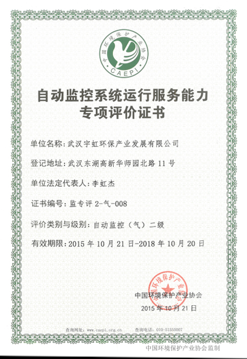 近日,武漢宇虹環(huán)保產(chǎn)業(yè)發(fā)展有限公司獲得由中國環(huán)保產(chǎn)業(yè)協(xié)會(huì)頒發(fā)的自動(dòng)監(jiān)控系統(tǒng)運(yùn)行服務(wù)能力專項(xiàng)評(píng)價(jià)證書—自動(dòng)監(jiān)控(氣)二級(jí)。
